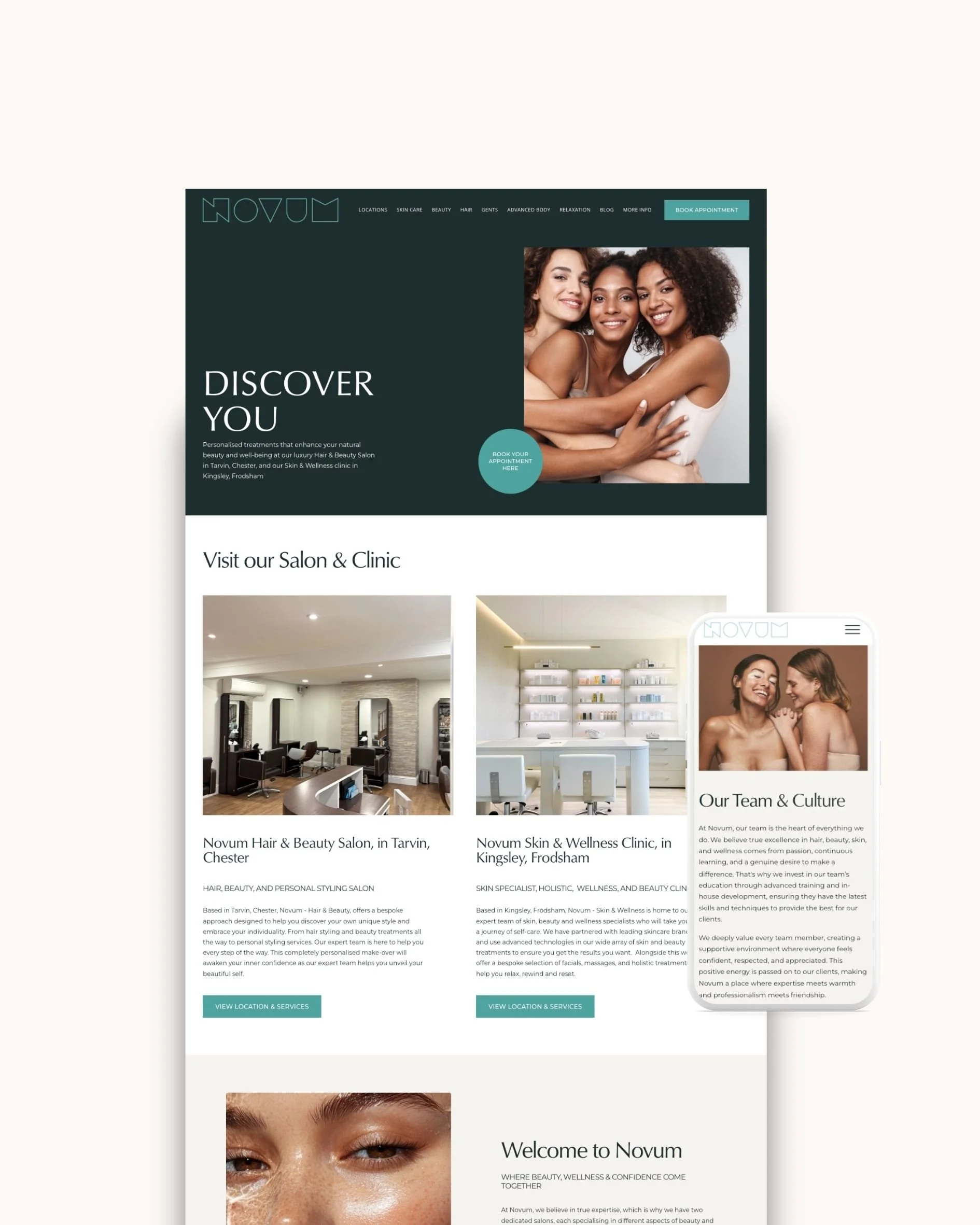 Novum SalonsWebsite →Novum Salons came to me because they wanted a website that truly reflected their values, their expertise - and the incredible five-star client experience they provide. Their original website was doing its job as a functional booking platform, but they had such a clear vision and purpose for their brand, and their previous website wasn't communicating this. Strategy Novum wanted to create a digital space that felt like walking through salon doors: relaxing and supportive. With visitor experience and SEO in mind, we designed an intuitive website structure - and created pages that provided helpful, detailed information that walked visitors through each service. The results ✢ Increased salon footfall: since launching, Julie has said that one day they had ten new clients in their salons - which is unheard of previously. ✢ SEO success: it’s early days - but the new website is already showing up on google searches - often as the Google AI Overview ✢ Novum have a website that reinforces their high quality service and values at every touchpoint ✢ (This was so important for Novum) - the team are proud of the new website: it’s been a huge motivator for everyone, and there’s been a significant up-turn in applications for job openings.