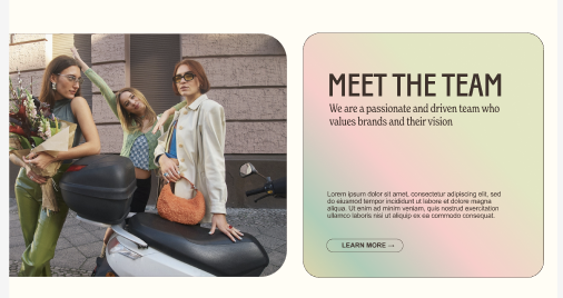 Gradient backgrounds applied to text blocks and sections, with optional image borders and styled link buttons. Creates vibrant, colorful section designs with smooth gradient transitions.