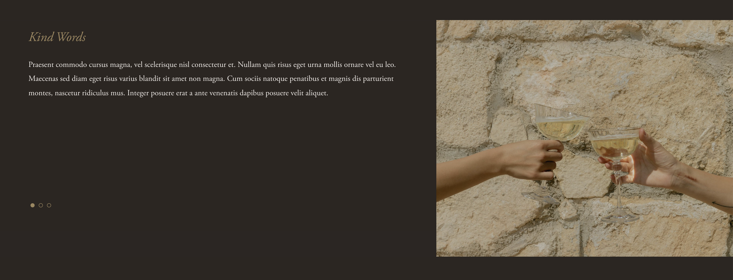 Creates a horizontal layout placing captions beside images. Custom styling for bullet navigation with configurable colors and positioning. Captions fade in smoothly with animations.